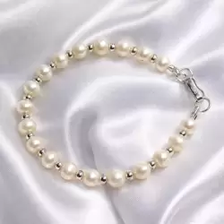 Pulsera elegante de plata con perlas blancas, diseñada con una delicada combinación de perlas redondas y pequeñas esferas plateadas intercaladas. Cuenta con cierre tipo broche en plata que brinda seguridad y comodidad. Es un accesorio clásico y sofisticado, ideal para complementar looks formales o dar un toque refinado al estilo diario.