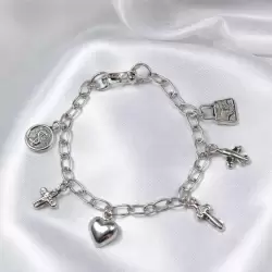 Pulsera de plata 950 tipo cadena con acabado brillante, decorada con delicados dijes colgantes como corazón, cruz, medalla y bolso, que le aportan un estilo moderno y simbólico. Su diseño versátil y femenino la convierte en el complemento ideal para realzar cualquier look con un toque elegante y significativo.