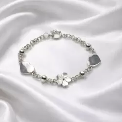Pulsera de plata 950 tipo cadena con acabado pulido, decorada con delicados dijes de corazones y una flor central que aportan un estilo femenino y romántico. Las pequeñas esferas metálicas complementan el diseño con un toque moderno y elegante. Ideal para usar a diario o regalar en una ocasión especial.