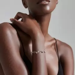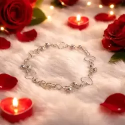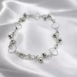 Pulsera de plata 950 con diseño delicado y romántico, compuesta por eslabones finos que integran corazones calados y pequeñas esferas pulidas que aportan movimiento y brillo. Su estilo femenino y elegante la convierte en el complemento perfecto para realzar cualquier look con un toque sutil y encantador.